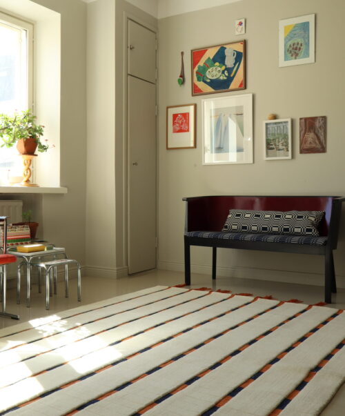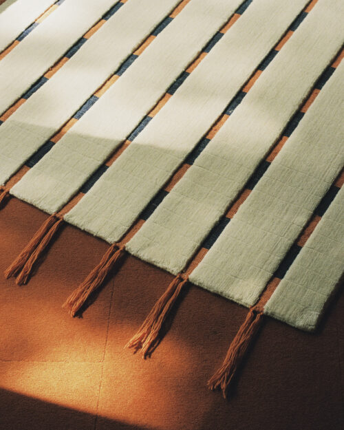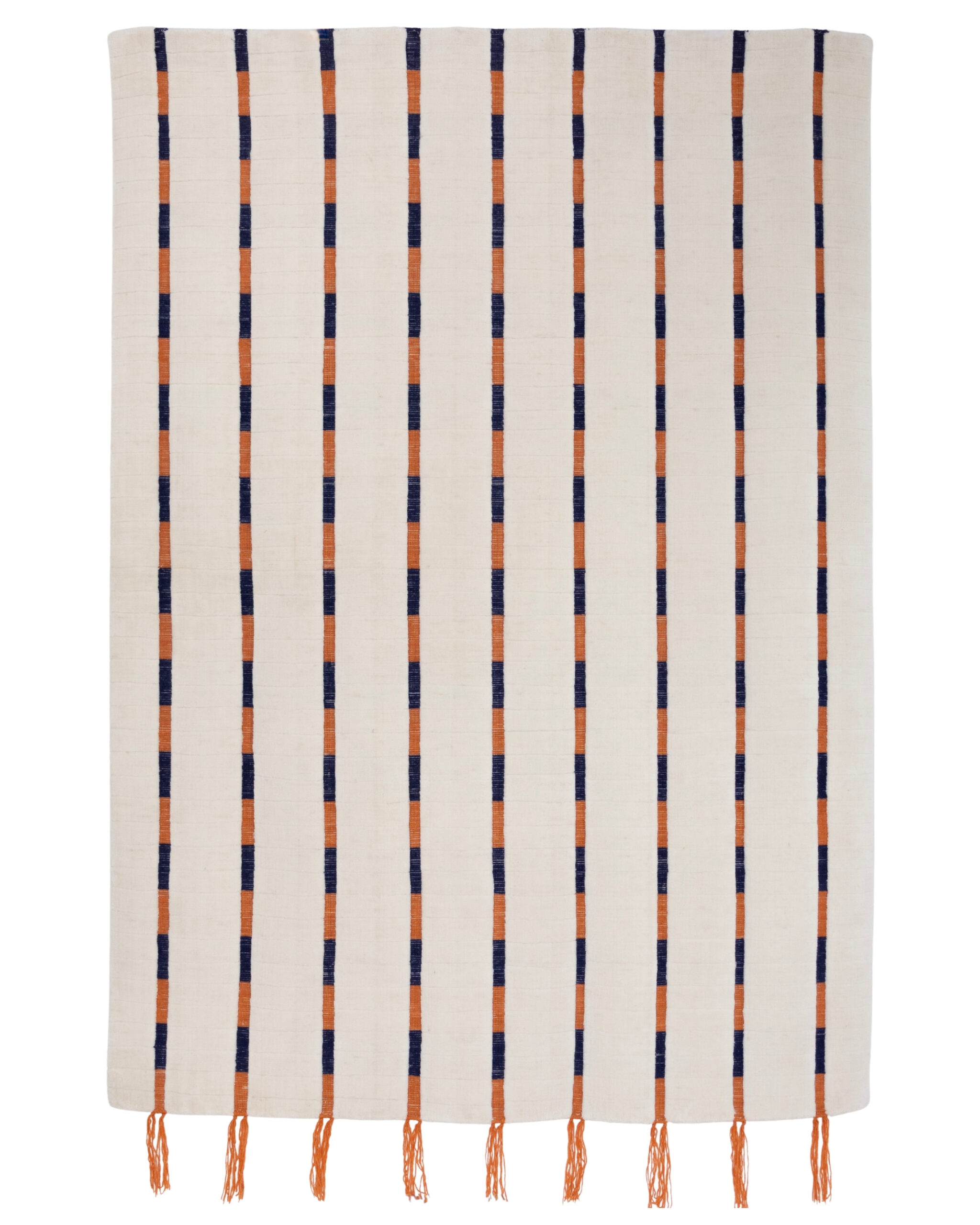 STREAM has one of a kind handloom weave design with soft natural base. Vertical stripes in vibrant orange and midnight blue create a flowing sense of movement.